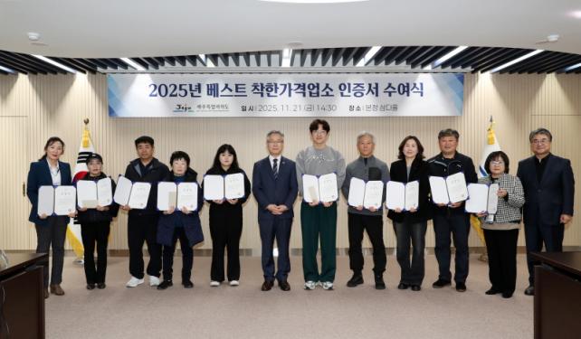 Áø¸í±â Á¦ÁÖµµ ÇàÁ¤ºÎÁö»ç´Â ¡°ÂøÇѰ¡°Ý¾÷¼Ò´Â ÇÕ¸®ÀûÀÎ °¡°ÝÀ¸·Î ¼ºñ½º¸¦ Á¦°øÇØ µµ³» ¹°°¡ ¾ÈÁ¤°ú Á¦ÁÖ À̹ÌÁö Çâ»ó¿¡ ±â¿©Çϰí ÀÖ´Ù¡±¸ç ¡°¾ÕÀ¸·Îµµ ÂøÇѰ¡°Ý¾÷¼Ò¿¡ ´ëÇÑ Áö¿øÃ¥À» Áö¼ÓÀûÀ¸·Î °ÈÇØ °¡°Ú´Ù¡±°í ¸»Çß´Ù.