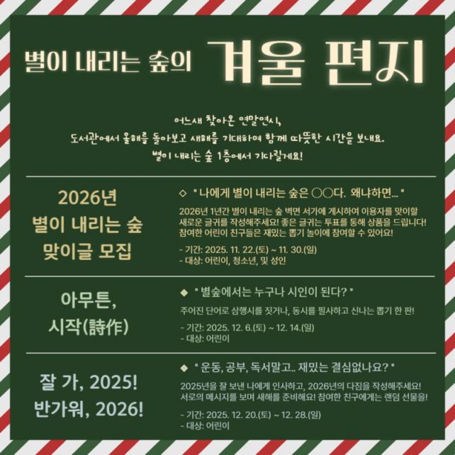 ¶ÇÇÑ, ³»´Þ 20ÀϺÎÅÍ 28ÀϱîÁö ¿î¿µµÇ´Â ¡®Àß °¡, 2025! ¹Ý°¡¿ö, 2026!¡¯¿¡¼´Â Âü¿©ÀÚµéÀÌ 2025³âÀ» Àß º¸³½ Àڽſ¡°Ô Àλ縦 ÀüÇÏ°í »õÇØÀÇ ´ÙÁüÀ» Àû¾î º¸¸ç ÀÛ¼ºµÈ ´ÙÁüÀº µµ¼°ü ³»ºÎ¿¡ Àü½ÃµÇ¾î ¼·ÎÀÇ »ý°¢À» °øÀ¯ÇÏ°í °ø°¨ÇÒ ¼ö ÀÖ´Â ±âȸ¸¦ Á¦°øÇÑ´Ù.