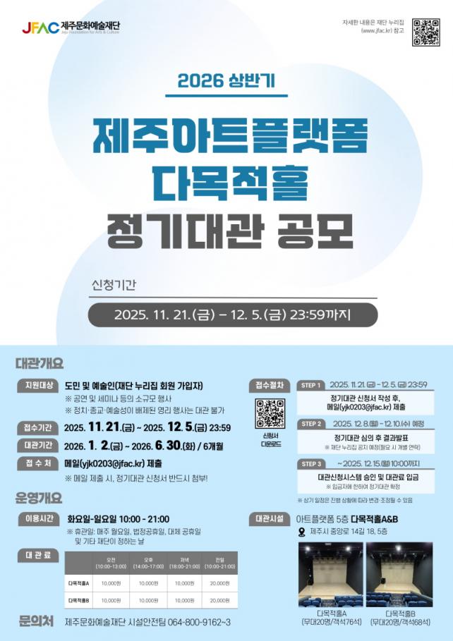 [Á¦ÁÖµµ¹Î½Å¹® = ¿À½ÂÅà ±âÀÚ] Á¦ÁÖ¹®È­¿¹¼úÀç´Ü(ÀÌ»çÀå ±è¼®À±, ÀÌÇÏ Àç´Ü)Àº 11¿ù 21ÀÏ(±Ý)ºÎÅÍ 12¿ù 5ÀÏ(±Ý)±îÁö Á¦ÁÖ¾ÆÆ®Ç÷§Æû ´Ù¸ñÀûȦÀÇ 2026³âµµ »ó¹Ý±â Á¤±â´ë°ü Á¢¼ö¸¦ ½Ç½ÃÇÑ´Ù°í ¹àÇû´Ù.
