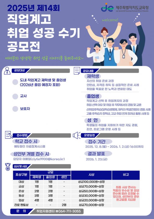 [Á¦ÁÖµµ¹Î½Å¹® = ¿À½ÂÅà ±âÀÚ] Á¦ÁÖÆ¯º°ÀÚÄ¡µµ±³À°Ã»Àº °íÁ¹ Ãë¾÷ ¼º°ø ¹®È­¸¦ È®»êÇϰí Á÷¾÷°è°í¿¡ ´ëÇÑ ±àÁ¤Àû ÀνÄÀ» ³ôÀ̱â À§ÇØ¡®Á¦14ȸ Á÷¾÷°è°í Ãë¾÷ ¼º°ø ¼ö±â °ø¸ðÀü¡¯À» ¿À´Â 8ÀϺÎÅÍ ³»³â 1¿ù 2ÀϱîÁö °³ÃÖÇÑ´Ù.