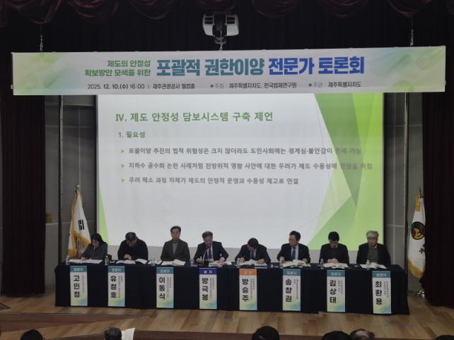 Á¦ÁÖµµ´Â 10ÀÏ ¿ÀÈÄ 4½Ã Á¦ÁÖ°ü±¤°ø»ç À£ÄÄȦ¿¡¼­ Çѱ¹¹ýÁ¦¿¬±¸¿ø°ú °øµ¿À¸·Î ¡®Æ÷°ýÀû ±ÇÇÑÀÌ¾ç ¾ÈÁ¤¼º È®º¸ ¹æ¾È ¸¶·ÃÀ» À§ÇÑ Àü¹®°¡ Åä·Ðȸ¡¯¸¦ °³ÃÖÇß´Ù. À̹ø Åä·Ðȸ¿¡´Â Çаè¿Í °ü°è±â°ü, µµ¹Î µî 100¿© ¸íÀÌ Âü¼®ÇØ Æ÷°ýÀû ±ÇÇÑÀÌ¾ç µµÀÔ¿¡ µû¸¥ ¾ÈÁ¤¼º ´ãº¸ ÀåÄ¡¸¦ ¾î¶»°Ô Á¦µµÈ­ÇÒ °ÍÀÎÁö ³íÀÇÇß´Ù.