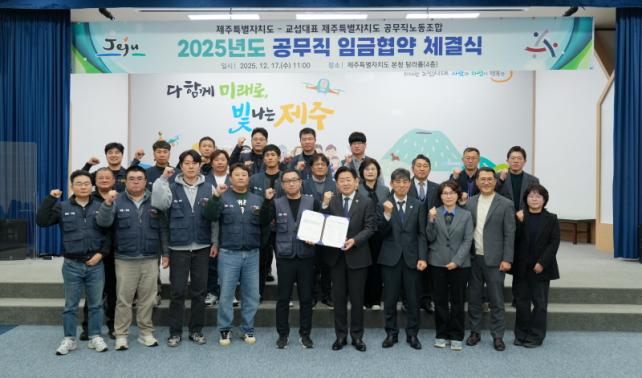Á¦ÁÖµµ¿Í ±³¼·´ëÇ¥ ³ëµ¿Á¶ÇÕÀÎ Á¦ÁÖµµ °ø¹«Á÷³ëµ¿Á¶ÇÕÀº 17ÀÏ ¿ÀÀü µµÃ» ޶óȦ¿¡¼­ ¡®2025³âµµ °ø¹«Á÷ ÀÓ±ÝÇù¾à¡¯À» ü°áÇß´Ù.