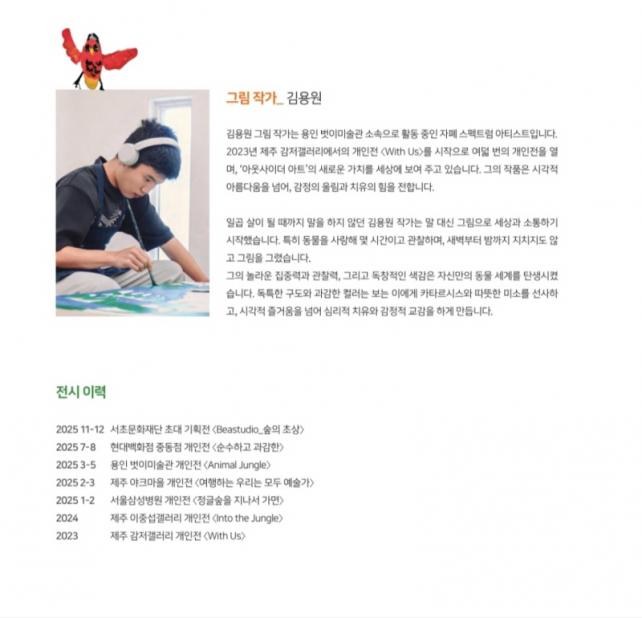 ±×¸²À» ±×¸° ±è¿ë¿ø ÇлýÀº ¿ëÀÎ ¹þÀ̹̼ú°ü ¼Ò¼Ó ¾ÆÆ®ºê·ò(Art Brut) ÀÛ°¡·Î¼­ °³ÀÎÀü 8ȸ¿Í 50¿© ȸÀÇ ´ÜüÀü¿¡ Âü¿©ÇÏ´Â µî Ȱ¹ßÇÑ Ã¢ÀÛ È°µ¿À» ÀÌ¾î ¿ÔÀ¸¸ç Áö³­ÇØ 1¿ù ¼­¿ï»ï¼ºº´¿ø¿¡¼­ ¿­¸° °³ÀÎÀü¿¡¼­ ÃâÆÇ»ç °ü°èÀÚÀÇ Á¦¾ÈÀ¸·Î À̹ø Ãâ°£ÀÌ ÃßÁøµÅ ±×ÀÇ ¿¹¼úÀû ¼ºÀåÀ» ´õ ¸¹Àº À̵é°ú °øÀ¯ÇÏ´Â °è±â°¡ µÇ¾ú´Ù.