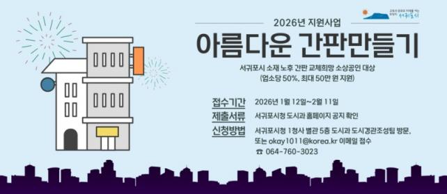 ½ÅûÀ» ¿øÇÏ´Â ´ë»óÀÚ´Â 1¿ù 12ÀϺÎÅÍ 2¿ù 11ÀϱîÁö ¼±ÍÆ÷½Ã ´©¸®Áý(www.seogwipo.go.kr) °í½Ã °ø°í °Ô½ÃÆÇÀ» È®ÀÎÇÏ¿© ½Åû¼¸¦ ÀÛ¼ºÇØ ¼±ÍÆ÷½Ã µµ½Ã°ú(µµ½Ã°æ°üÁ¶¼ºÆÀ)·Î Á¢¼öÇϸé ÇöÀå È®ÀÎ, µðÀÚÀÎ ÇùÀÇ, º¸Á¶±Ý ½ÉÀǸ¦ °ÅÃÄ 3¿ù Áß ´ë»óÀÚ°¡ °áÁ¤µÉ ¿¹Á¤ÀÌ´Ù.