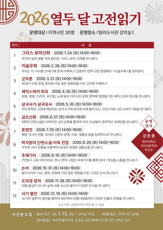 ¡®¿­µÎ ´Þ °íÀü Àб⡮´Â ¸Å¿ù ÇÑ ÆíÀÇ °íÀüÀ» ÇÔ²² ÀÐ°í °­¿¬À» ÅëÇØ ´Ù¾çÇÑ ÇØ¼®À» °øÀ¯ÇÏ´Â ÇÁ·Î±×·¥À¸·Î ¿ÃÇØ´Â ±×¸®½º ·Î¸¶½ÅÈ­, ±ºÁÖ·Ð, »ï±¹»ç±â, ±Ý¿À½ÅÈ­ µî 12ÆíÀÇ µ¿¡¤¼­¾ç °íÀüÀ» Ȱ¿ëÇÏ¿© °íÀü ¼Ó¿¡ ´ã±ä ÄÜÅÙÃ÷¸¦ ¸¸³ª º¼ ¿¹Á¤ÀÌ´Ù.