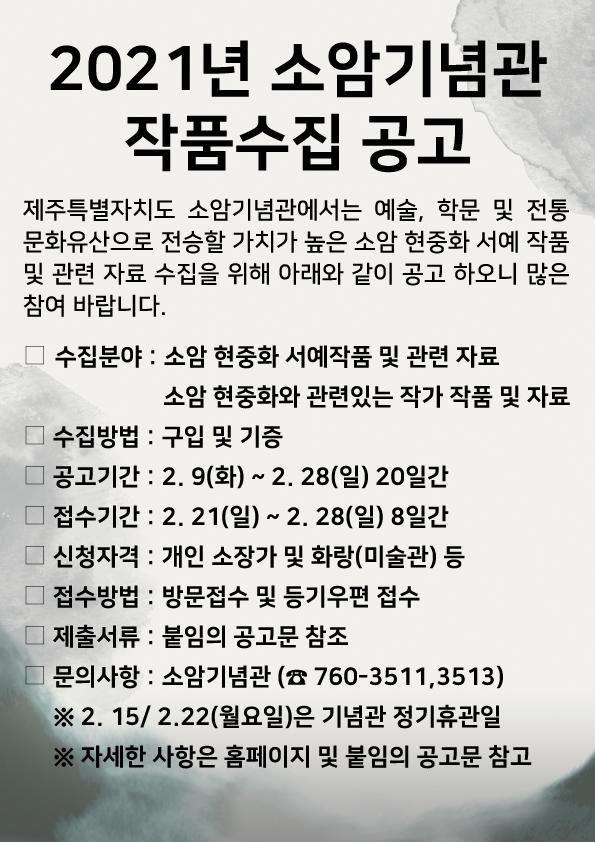 [Á¦ÁÖµµ¹Î½Å¹® = ³²Àç¿Á ±âÀÚ] ¼­±ÍÆ÷½Ã ¼Ò¾Ï±â³ä°üÀº ͺ ¼Ò¾Ï ÇöÁßÈ­(1907~1997) ¼±»ýÀÇ ¼­¿¹ ÀÛǰ ¹× °ü·Ã ÀڷḦ ¼öÁýÇϱâ À§ÇØ 2¿ù 9ÀÏ(È­)ºÎÅÍ 28ÀÏ(ÀÏ)±îÁö ÀÛǰ¼öÁý °ø°í¸¦ ÁøÇàÇϸç Á¢¼ö±â°£Àº 2¿ù 21ÀÏ(ÀÏ)ºÎÅÍ 2¿ù 28ÀÏ(ÀÏ)±îÁöÀÌ´Ù. ¼­±ÍÆ÷½Ã ¼Ò¾Ï±â³ä°üÀº ¸Å³â ¿¹¼ú, Çй® ¹× ÀüÅ빮ȭ À¯»êÀ¸·Î Àü½Â °¡Ä¡°¡ ³ôÀº ¼Ò¾Ï ÇöÁßÈ­ÀÇ ¼­¿¹ ÀÛǰ°ú °ü·Ã ÀÚ·áµéÀ» ´Ù¾çÇÏ°Ô ¼öÁý(±¸ÀÔ¡¤±âÁõ)Çϰí ÀÖ´Ù. ¿ÃÇØ´Â ¼Ò¾Ï ÇöÁßÈ­ÀÇ »î°ú ÀÛǰ¼¼°è¸¦ ´Ù°¢ÀûÀ¸·Î Á¶¸íÇϰíÀÚ ¼Ò¾ÏÀÇ ÀÛǰ À̿ܿ¡µµ ±×¿Í ±³·ùÇϰųª ȤÀº °ü°è¸¦ ¸ÎÀº ¼­¿¹°¡µéÀÇ ÀÛǰ ¹× ÀÚ·áµµ ÇÔ²² ¼öÁýÇÒ ¿¹Á¤ÀÌ´Ù. ½ÅûÀº ¼Ò¾Ï±â³ä°ü ¹æ¹® ¹× µî±â¿ìÆíÀ» ÅëÇØ °¡´ÉÇϸç ÀÚ¼¼ÇÑ »çÇ×Àº ¼­±ÍÆ÷½Ãû ȨÆäÀÌÁö ¹× ¼Ò¾Ï±â³ä°ü ȨÆäÀÌÁö¸¦ ÅëÇØ È®ÀÎÇÒ ¼ö ÀÖ´Ù. ¼Ò¾Ï±â³ä°üÀº ÇöÀç±îÁö ÃÑ 686Á¡ÀÇ ¼ÒÀåǰÀ» º¸À¯Çϰí ÀÖÀ¸¸ç, ¼öÁýµÈ ÀÛǰµéÀº Àü½Ã¸¦ ÅëÇØ °ü¶÷°´°ú ¸¸³ª¸ç ¼Ò¾Ï ¼­Ã¼ ¿¬±¸ µî ±ÍÁßÇÑ ÀÚ·á·Î Ȱ¿ëµÇ°í ÀÖ´Ù. ¾ç½Â¿­ ¼­±ÍÆ÷½Ã ¹®È­¿¹¼ú°úÀåÀº ¡°¼­±ÍÆ÷½Ã´Â ¸Å³â ¼Ò¾Ï ÇöÁßÈ­ ¼±»ý´ÔÀÇ ÀÛǰ ¹× ÀڷḦ È®º¸Çϱâ À§ÇØ ¸¹Àº ³ë·ÂÀ» Çϰí ÀÖ´Ù. À̹ø ÀÛǰ ¼öÁý °ø°í¸¦ ÅëÇØ ¼Ò¾Ï ¼±»ý´ÔÀÇ ±ÍÁßÇÑ ÀÛǰÀ» ¸¸³¯ ¼ö Àֱ⸦ °í´ëÇϸç ÀÛǰÀ» ¼ÒÀ¯ÇÏ°í °è½Å ºÐµéÀÇ Àû±ØÀûÀÎ °ü½É°ú Âü¿© ºÎʵ台´Ù.¡±¶ó°í ¹àÇû´Ù.