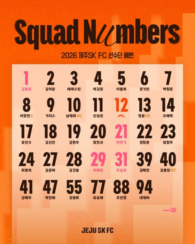 Á¦ÁÖSK´Â 2026½ÃÁð K¸®±×1 °³¸·À» ¾ÕµÎ°í ÀÚÀ²ÀûÀÎ ÇùÀÇ °úÁ¤À» ÅëÇØ ¼±¼ö´Ü µî¹øÈ£¸¦ °áÁ¤Çß´Ù. ±èµ¿ÁØ(1¹ø), ÀÌÅ»·Î(5¹ø), ÀÌâ¹Î(8¹ø), ³²ÅÂÈñ(10¹ø), Á¤¿î(13¹ø), À¯Àμö(17¹ø), ¾ÈÂù±â(21¹ø), ÀÓâ¿ì(23¹ø), ÃÖº´¿í(24¹ø), ±èÁØÇÏ(27¹ø), ±è·û¼º(40¹ø) µî ±âÁ¸ ¼±¼öµéÀÇ µî¹øÈ£´Â ´ëºÎºÐ º¯È°¡ ¾ø´Ù.