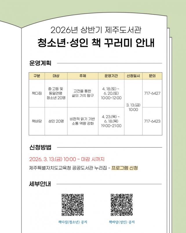 Á¦ÁÖµµ¼­°ü, 2026³â »ó¹Ý±â û¼Ò³â¡¤¼ºÀÎ ´ë»ó Ã¥ ²Ù·¯¹Ì ¿î¿µ