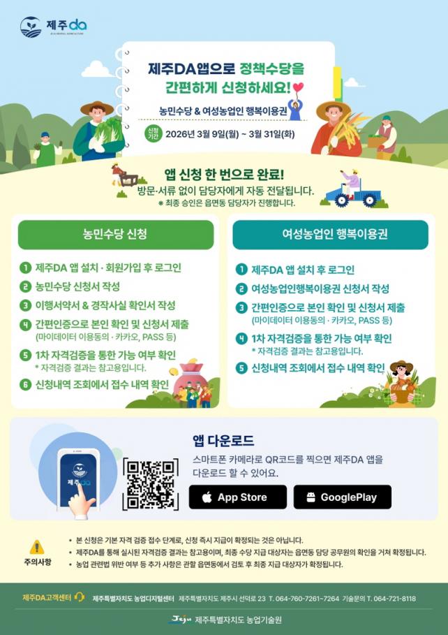 ³ó¹Î¼ö´ç ¹× ¿©¼º³ó¾÷ÀÎ ÇູÀÌ¿ë±Ç Áö¿ø»ç¾÷ ½Åû±â°£Àº 3¿ù 31ÀϱîÁöÀ̸ç, Á¦ÁÖDA ¾ÛÀ» ÅëÇÑ ºñ´ë¸é ½Åû ¼ºñ½º´Â 3¿ù 9ÀÏ ½Ã¹ü ¿î¿µÀ» ½ÃÀÛÇØ °ø°ø ¸¶À̵¥ÀÌÅÍ ¼ºñ½º ½ÂÀÎ ÀýÂ÷¸¦ °ÅÃÄ 3¿ù 16ÀϺÎÅÍ Á¤½Ä ¿î¿µÇÒ ¿¹Á¤ÀÌ´Ù. Á¦ÁÖDA ¾ÛÀ» ÀÌ¿ëÇÏ¸é °£ÆíÀÎÁõ(PASS, īī¿À µî)À» ÅëÇÑ º»ÀÎ È®Àΰú °ø°ø ¸¶À̵¥ÀÌÅÍ Á¦°ø µ¿ÀÇ ÈÄ ½Åû¼ ÀÛ¼º, ÀÌÇ༾à, °æÀÛ »ç½Ç È®ÀÎ µî ½Åû ÀýÂ÷¸¦ ¸ð¹ÙÀÏ¿¡¼ °£ÆíÇÏ°Ô Ã³¸®ÇÒ ¼ö ÀÖ´Ù.