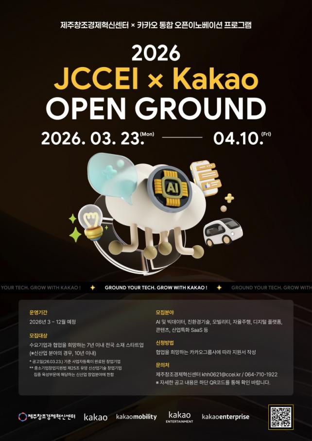¡®2026 JCCEI X Kakao ¿ÀÇ ±×¶ó¿îµå¡¯´Â Á¦ÁÖ¼¾ÅÍÀÇ Àü´ã ´ë±â¾÷ÀΠīī¿À¿Í °øµ¿À¸·Î ±âȹÇÑ ¿ÀÇÂÀ̳뺣ÀÌ¼Ç ÇÁ·Î±×·¥À¸·Î, īī¿À ¹× īī¿À±×·ì»çÀÇ »ç¾÷ ºÐ¾ß¿Í ¿¬°è °¡´ÉÇÑ À¯¸Á ½ºÅ¸Æ®¾÷À» ¹ß±¼ÇØ ±â¼ú °ËÁõ(PoC), »ç¾÷È Çù·Â µî ½ÇÁúÀûÀÎ Çù¾÷ ±âȸ¸¦ Á¦°øÇÏ´Â °ÍÀÌ Æ¯Â¡ÀÌ´Ù.