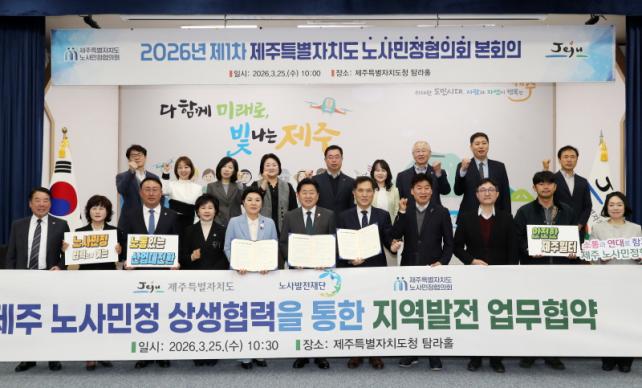 Á¦ÁÖÆ¯º°ÀÚÄ¡µµ´Â 25ÀÏ µµÃ» ޶óȦ¿¡¼­ 2026³â Á¦1Â÷ Á¦ÁÖ³ë»ç¹ÎÁ¤ÇùÀÇȸ º»È¸ÀǸ¦ ¿­¾î ¡®»ê¾÷´ëÀüȯ ´ëÀÀ°ú ÀÏÅÍ À§Çè°ÝÂ÷ ÇØ¼Ò¸¦ À§ÇÑ Á¦ÁÖÆ¯º°ÀÚÄ¡µµ ³ë»ç¹ÎÁ¤ °øµ¿¼±¾ð¹®¡¯À» äÅÃÇϰí, ³ë»ç¹ßÀüÀç´Ü°ú »ó»ýÇù·Â ¾÷¹«Çù¾àÀ» ü°áÇß´Ù.