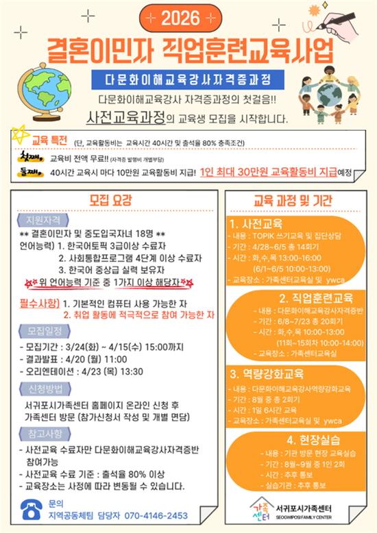 ½Åû´ë»óÀº °áÈ¥À̹ÎÀÚ ¹× ÁßµµÀÔ±¹ÀÚ³àÀ̸ç, °»ç¸¦ ¾ç¼ºÇÏ´Â °úÁ¤ÀÎ ¸¸Å, ÀÏÁ¤¼öÁØ ÀÌ»óÀÇ Çѱ¹¾î ±¸»ç ´É·Â°ú ÄÄÇ»ÅÍ È°¿ë´É·ÂÀ» °®Ãá Áö¿øÀÚ¸¦ ¼±¹ßÇÒ ¿¹Á¤ÀÌ´Ù. Á¢¼ö´Â ¿À´Â 4¿ù 15ÀϱîÁö 18¸íÀ» ¸ðÁýÇϸç, 4¿ù 28ÀÏ Ã¹ »çÀü±³À°À» ½ÃÀÛÀ¸·Î ¾à 5°³¿ù °£ÀÇ ±³À° °úÁ¤ÀÌ ÁøÇàµÈ´Ù.