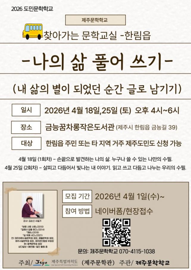 Á¦ÁÖ¹®ÇÐÇб³ °ü°èÀÚ´Â ¡°Ã£¾Æ°¡´Â ¹®Çб³½ÇÀº Áö¿ª ÁֹεéÀÌ »ýȰ ¼Ó¿¡¼­ ¹®ÇÐÀ» °æÇèÇÒ ¼ö ÀÖµµ·Ï ±âȹµÈ ÇÁ·Î±×·¥¡±À̶ó¸ç ¡°±Û¾²±â¸¦ óÀ½ ½ÃÀÛÇÏ´Â ºÐµéµµ ºÎ´ã ¾øÀÌ Âü¿©ÇØ ÀÚ½ÅÀÇ À̾߱⸦ Ç®¾î³¾ ¼ö ÀÖ´Â °è±â°¡ µÇ±æ ¹Ù¶õ´Ù¡±°í ¸»Çß´Ù.