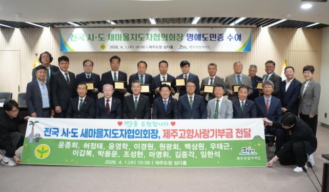 Á¦ÁÖµµ´Â 1ÀÏ ¿ÀÀü µµÃ» »ï´ÙȦ¿¡¼­ Àü±¹ ½Ãµµ »õ¸¶À»ÁöµµÀÚÇùÀÇȸÀå ¸í¿¹µµ¹ÎÁõ ¼ö¿©½ÄÀ» ¿­¾ú´Ù. Çà»ç¿¡´Â ¾çÀ±È£ »õ¸¶À»ÁöµµÀÚÁß¾ÓÇùÀÇȸÀåÀ» ºñ·ÔÇØ Àü±¹ °¢ ½Ãµµ¸¦ ´ëÇ¥ÇÏ´Â ÇùÀÇȸÀå µî 20¸íÀÌ Âü¼®Çß´Ù.