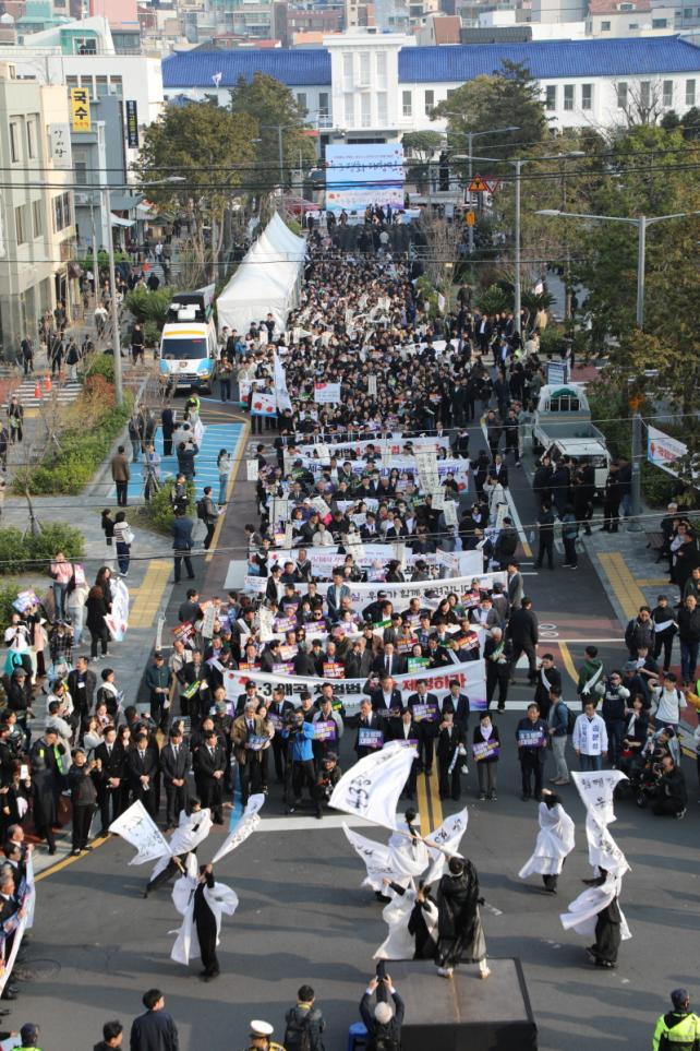 4¡¤3À¯Á·°ú µµ¹ÎÀ» ºñ·ÔÇØ Àü±¹ ´ëÇлý, û¼Ò³â, ½Ã¹Î´Üü°¡ ¼¼ °¥·¡ Ãâ¹ß ÁöÁ¡¿¡¼­ ¹ßÀ» ¶¼ Çϳª·Î ¸ðÀÌ´Â ¡®4¡¤3 ÆòÈ­ ´ëÇàÁø¡¯ÀÌ ÆîÃÄÁ³´Ù. À̳¯ ÇàÁøÀº ¡®±â¾ïÀÇ °è½Â¡¯°ú ¡®°ú°Å»ç ¿¬´ë¡¯¶ó´Â 4¡¤3ÀÇ ÇÙ½É °¡Ä¡¸¦ ¿Â¸öÀ¸·Î ±¸ÇöÇÑ ÀÚ¸®¿´´Ù. 4¡¤3 ÆòÈ­ ´ëÇàÁøÀº °ü´öÁ¤, Á¦ÁֹμÓÀÚ¿¬»ç¹Ú¹°°ü, Á¦ÁÖ½Ãû ¾Õ µî ¼¼ °÷¿¡¼­ µ¿½Ã¿¡ ½ÃÀ۵ƴÙ.