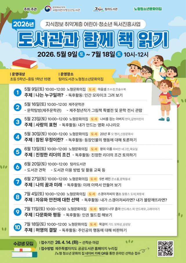 Âü¿©¸¦ Èñ¸ÁÇÏ´Â ½Ã¹ÎÀº 4¿ù 14ÀϺÎÅÍ Á¦ÁÖÆ¯º°ÀÚÄ¡µµ °ø°øµµ¼°ü ´©¸®Áý(https://www.jeju.go.kr/lib)°ú ³ëÇü û¼Ò³â¹®ÈÀÇÁý ³×À̹öÄ«Æä¸¦ ÅëÇØ ½ÅûÇÒ ¼ö ÀÖ´Ù. ¹®Á¤Èñ ޶󵵼°üÀåÀº ¡°Ã»¼Ò³âµéÀÌ À̹ø ÇÁ·Î±×·¥À» ÅëÇØ Ã¥ Àб⸦ º¸´Ù Ä£±ÙÇÏ°í ´Éµ¿ÀûÀΠȰµ¿À¸·Î °æÇèÇϰí, ¶Ç·¡ °£ ±³·ù¿Í Çù·ÂÀ» ÅëÇØ »çȸ¼º°ú °øµ¿Ã¼ ÀǽÄÀÌ ÁõÁøµÇ´Â ½Ã°£ÀÌ µÇ±æ ¹Ù¶õ´Ù¡±°í ¸»Çß´Ù.