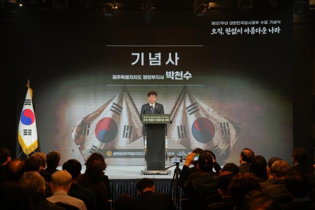 ¹Úõ¼ö µµÁö»ç ±ÇÇÑ´ëÇàÀº¡°´ëÇѹα¹ ÀÓ½ÃÁ¤ºÎÀÇ ¹ýÅë°ú ¼±¿­µéÀÇ µ¶¸³ Á¤½ÅÀº ¿À´Ã³¯ ´ëÇѹα¹ÀÇ ÀÚÀ¯¿Í ¹ÎÁÖÁÖÀǸ¦ ¶°¹ÞÄ¡´Â ±Ù°£¡±À̶ó¸ç,¡°±× Á¤½ÅÀº Áö³­ÇØ µµ¹Î°ú ÇÔ²² ¼±Æ÷ÇÑ ¡®Á¦ÁÖÆòÈ­ÀαÇÇåÀ塯¿¡µµ À̾îÁ® ÀÖ´Ù¡±°í ¸»Çß´Ù. ÀÌ¾î ¡°Á¦ÁÖµµ´Â ÇåÀåÀÇ °¡Ä¡¸¦ ¹ÙÅÁÀ¸·Î ¡®¼¼°èÆòÈ­ÀÇ ¼¶¡¯ÀÇ ¿ªÇÒÀ» ´õ¿í °­È­Çϰí, ±¹°¡À¯°øÀÚ¿Í À¯°¡Á·¿¡ ´ëÇÑ Á¸°æ°ú ¿¹¿ì¿¡µµ ÃÖ¼±À» ´ÙÇϰڴ١±°í °­Á¶Çß´Ù.