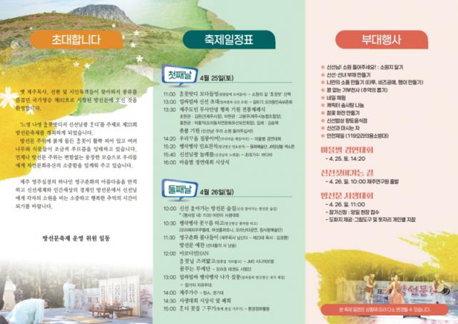 ÁÖ¿ä Çà»ç·Î´Â ¹«»ç¾È³ç Á¦ÁÖµµ¹Î Çູ±â¿øÁ¦, Á¦ÁÖ¸ñ»ç ÇàÂ÷ À翬, ¡®½Å¼±´Ô! ¿ì¸® ¼Ò¿ø µé¾îÁֽʼ¡¯ ÃÐºÒ±â¿ø, Àü¹®¿¹¼ú °ø¿¬, °¢ ¸¶À»ÀÌ Âü¿©ÇÏ´Â ¡®¿ì¸®ᄆᆞÀ» Áú·îÀÌ¿©¡¯ °æ¿¬ ÇÁ·Î±×·¥ µîÀÌ ¸¶·ÃµÅ ÁֹΠÈÇÕ°ú °øµ¿Ã¼ Á¤½ÅÀ» µÇ»õ±â´Â ÀÚ¸®°¡ µÉ Àü¸ÁÀÌ´Ù.