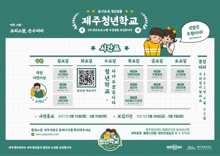 [Á¦ÁÖµµ¹Î½Å¹® = ³²Àç¿Á ±âÀÚ] Á¦ÁÖû³â¼¾ÅÍ´Â ¿À´Â 3¿ù 2ÀϱîÁö ¡¸Á¦ÁÖû³âÇб³ 1Â÷ Á¤±ÔÇб⡹¿¡ Âü¿©ÇÒ Ã»³âÀ» ¸ðÁýÇÑ´Ù. ÀÌ »ç¾÷Àº Á¦ÁÖÁö¿ª û³âµéÀÇ ¿ª·®°³¹ß ¹× »îÀÇ Áú Çâ»óÀ» À§ÇØ »çȸ¡¤Áø·Î, ±â¼ú¡¤°¡Á¤, ¹®È­¡¤¿©°¡ µî ´Ù¾çÇÑ ºÐ¾ßÀÇ ±³À° ¹× üÇè Ȱµ¿ ±âȸ¸¦ Á¦°øÇÏ¸ç ¸Å³â µµ³» û³âµé¿¡°Ô Æò±Õ 10 ´ë 1 ÀÌ»óÀÇ °æÀï·üÀ» º¸ÀÌ¸ç ¸¹Àº °ü½É°ú »ç¶ûÀ» ¹Þ°í ÀÖ´Ù. À̹ø 1Â÷ Á¤±ÔÇбâ´Â ¡âÀÚ±âÀÌÇØ:Ä÷¯Å×¶óÇÇ ¡â¾÷»çÀÌŬ¸µ:¾ç¸»¸ñ°ø¿¹ ¡â¾ÆÀÌÆÐµåµå·ÎÀ× ¡âÇöó¿ö ¡â¾ÆÅ©¸±È­ ¡âµµÀÚ°ø¿¹ ¡â¶óź ¡â¿ìÄð·¼·¹ µî ÃÑ 10°³ÀÇ Å¬·¡½º°¡ ÁøÇàµÈ´Ù. ¸ðÁý ±â°£Àº 2¿ù 26ÀϺÎÅÍ 3¿ù 2ÀϱîÁöÀ̰í, ¸¸ 19¼¼ ÀÌ»óºÎÅÍ 39¼¼±îÁöÀÇ Ã»³âÀ̶ó¸é ´©±¸³ª Á¦ÁÖû³â¼¾ÅÍ È¨ÆäÀÌÁö(www.jejuyouth.com)¿¡¼­ ½Åû °¡´ÉÇÏ¸ç ·£´ý Ãß÷À» ÅëÇØ ¼±¹ßÇÑ´Ù. Á¦ÁÖû³â¼¾ÅÍ °ü°èÀÚ´Â ¡°»õ·Î¿î Ãâ¹ßÀ» ¾Ë¸®´Â 3¿ù, »õ·Î¿î ºÐ¾ß¸¦ ¹è¿ì¸ç ¼ºÀåÇÒ ¼ö ÀÖµµ·Ï ´Ù¾çÇÑ Å¬·¡½º¸¦ ÁغñÇßÀ¸´Ï ¸¹Àº Âü¿©¸¦ ¹Ù¶õ´Ù.¡±¶ó°í ¸»Çß´Ù. ÀÚ¼¼ÇÑ ³»¿ëÀº Á¦ÁÖû³â¼¾ÅÍ È¨ÆäÀÌÁö ³» °ø°í¹®À» ÅëÇØ È®ÀÎ °¡´ÉÇϸç, ±Ã±ÝÇÑ »çÇ×Àº Á¦ÁÖû³â¼¾ÅÍ(¢Ï070-4235-9494)·Î ¹®ÀÇÇÏ¸é µÈ´Ù.