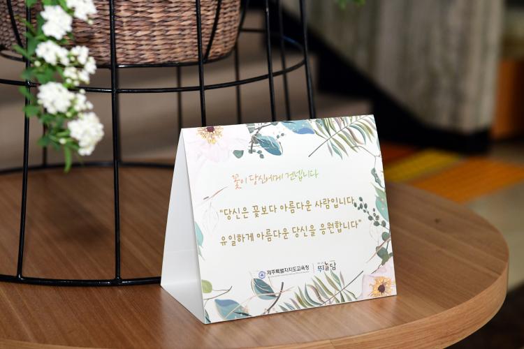 µµ±³À°Ã»Àº º»Ã» 1Ãþ Çö°ü Áß¾Ó °è´Ü ÀÔ±¸ ¾çÂÊ¿¡ ²É¹Ù±¸´Ï¸¦ Àü½ÃÇß´Ù. ƯÈ÷ ²É¹Ù±¸´Ï¸¶´Ù "´ç½ÅÀº ²Éº¸´Ù ¾Æ¸§´Ù¿î »ç¶÷ÀÔ´Ï´Ù. À¯ÀÏÇÏ°Ô ¾Æ¸§´Ù¿î ´ç½ÅÀ» ÀÀ¿øÇÕ´Ï´Ù¡±, ¡°È¦·Î ÇÇ´Â ²ÉÀº ¾ø½À´Ï´Ù. ´ç½ÅÀº È¥ÀÚ°¡ ¾Æ´Ï¿¡¿ä. ´ç½ÅÀÌ ¿ôÀ¸¸é ³ªµµ ÇູÇÕ´Ï´Ù¡±¶ó´Â ¹®±¸¸¦ ´ã¾Æ ÈÈѳ󰡿¡ ´ëÇÑ °ü½É°ú ¼Òºñ Ȱ¼ºÈ¸¦ µ¶·ÁÇϰí ÀÖ´Ù.