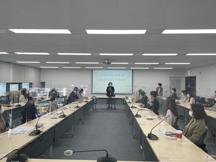 º¹Áö ¾ÆÄ«µ¥¹Ì´Â º¹Áö ½ÃÃ¥ ¹× ½Ç¹« °Á¿¡ ´ëÇÑ ±³À°À» ÁøÇàÇÏ¿© º¹Áö°ø¹«¿øÀÇ Àü¹®¼ºÀ» °ÈÇÏ´Â ÇÑÆí, º¹Áö Á¦µµÀÇ °³¼±À» µµ¸ðÇϰí À¾¸éµ¿ ÇöÀå¿¡¼ÀÇ °íÃæ»çÇ× µîÀ» °øÀ¯Çϱâ À§ÇØ ¸¶·ÃµÇ¾ú´Ù.