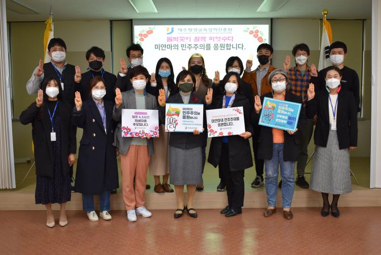 Á¦ÁÖÆò»ý±³À°ÀåÇÐÁøÈï¿ø ÀÓÁ÷¿ø Àϵ¿Àº 4¤ý3ÀÇ ¾ÆÇÄÀ» »ó¡ÇÏ´Â µ¿¹é²É ÇÇÄϰú ÇÔ²² ÀÚÀ¯, ¼±°Å, ¹ÎÁÖÁÖÀǸ¦ ¶æÇÏ´Â ¼¼ ¼Õ°¡¶ô °æ·Ê·Î ¹Ì¾á¸¶ÀÇ ÆòÈ¿Í ¹ÎÁÖÁÖÀǸ¦ ÀÀ¿øÇß´Ù.