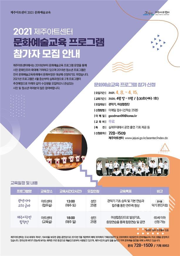 ±³À° Âü¿© ½ÅûÀº 4¿ù 8ÀϺÎÅÍ 15ÀϱîÁö Á¦ÁÖ¾ÆÆ®¼¾ÅÍ È¨ÆäÀÌÁö(www.jejusi.go.kr/acenter/index.do)¸¦ ÅëÇØ ½ÅûÇÏ¸é µÈ´Ù. °úÁ¤º° ¸ðÁýÀοøÀº ÇÁ·Î±×·¥º° 25¸í ³»¿Ü ¸ðÁýÇÒ ¿¹Á¤ÀÌ´Ù.