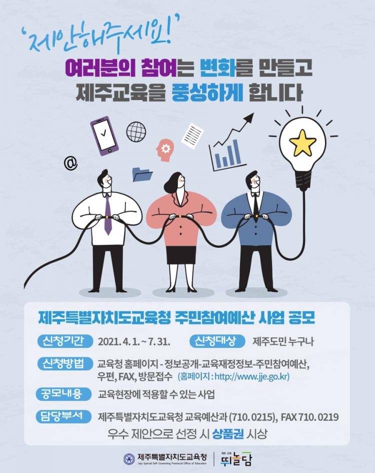 ÁÖ¹ÎÂü¿©¿¹»êÁ¦´Â ÁÖ¹ÎÀÌ ¿¹»ê °úÁ¤¿¡ Á÷Á¢ Âü¿©ÇØ Á¦ÁÖ ±³À°¿¡ ÇÊ¿äÇÑ »ç¾÷À» Á¦¾ÈÇÏ°í °áÁ¤ÇÏ´Â Á¦µµ·Î, µµ±³À°Ã»Àº ¿À´Â 7¿ù 31ÀϱîÁö ±³À° ÇöÀå¿¡ Àû¿ë °¡´ÉÇÑ »ç¾÷¿¡ ´ëÇØ¼ ÁÖ¹ÎÂü¿©¿¹»êÁ¦ »ç¾÷°ø¸ð¸¦ ÁøÇàÇÒ ¿¹Á¤ÀÌ´Ù.