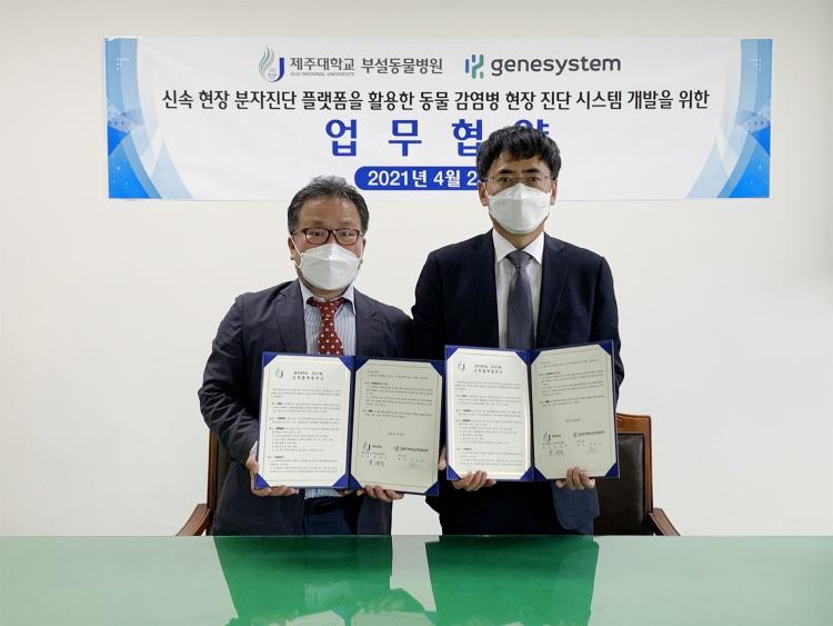 ¼À¯Áø Áø½Ã½ºÅÛ ´ëÇ¥´Â ¡°±×µ¿¾È ´ç»ç Ç÷§Æû ±â¼úÀ» Ȱ¿ëÇÑ ´Ù¾çÇÑ ¿¬±¸ Ȱµ¿À» ¼º°øÀûÀ¸·Î ¼öÇàÇØ¿Â Á¦ÁÖ´ë ºÎ¼³µ¿¹°º´¿øÀÇ Àü¹®¼ºÀ» Åä´ë·Î À̹ø Çù¾àÀ» ÅëÇØ ½ÇÁ¦ µ¿¹° ÀÓ»ó ºÐ¾ß¿¡¼ Ȱ¿ë °¡´ÉÇÑ ½Ç¿ëÀûÀÎ Áø´Ü ½Ã½ºÅÛÀ» ¼º°øÀûÀ¸·Î °³¹ßÇÒ ¼ö ÀÖÀ» °ÍÀ¸·Î È®½ÅÇÑ´Ù¡±¸é¼ ¡°Áø½Ã½ºÅÛÀº À̹ø Çù¾àÀ» ÅëÇØ °³¹ß ±â¼úÀ» Åä´ë·Î µ¿¹° Áø´Ü ºÐ¾ß Æ÷Æ®Æú¸®¿À ´Ù°¢È¸¦ ½ÇÇöÇÔÀ¸·Î½á ±Û·Î¹ú µ¿¹° Áø´Ü½ÃÀå ÁøÀÔÀ» ¾Õ´ç±æ °Í¡±À̶ó°í ¸»Çß´Ù.