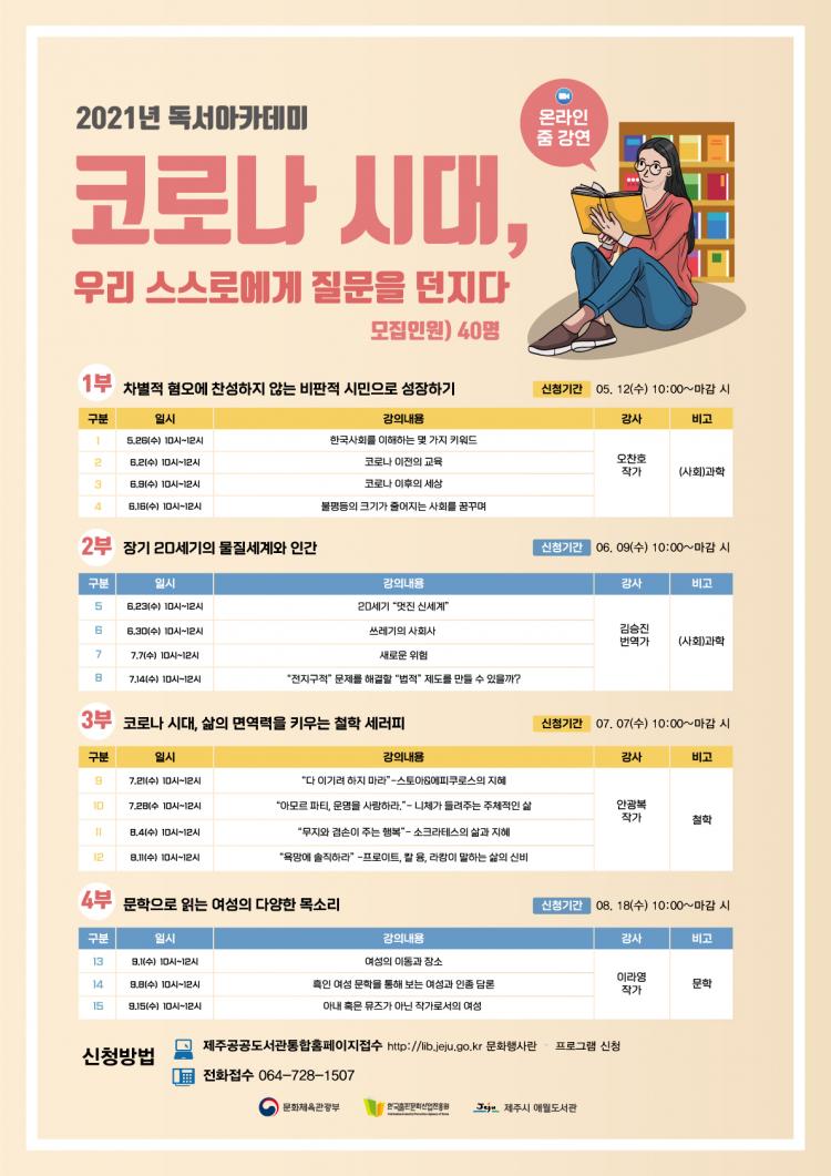 ÇÁ·Î±×·¥Àº ¿À´Â 5¿ù 26ÀϺÎÅÍ ÃÑ 15ȸ¿¡ °ÉÃÄ ¸ÅÁÖ ¼ö¿äÀÏ ¿ÀÀü 10½Ã¿¡ ºñ´ë¸éÀ¸·Î ÁøÇàµÇ¸ç, Âü¿©ÀÚ´Â ÀÛ°¡º° ¼ÒÁÖÁ¦¿¡ ¸Â°Ô 1~4ºÎ·Î ³ª´©¾î 40¸í¾¿ ¼±Âø¼øÀ¸·Î ¸ðÁýÇÑ´Ù. ½ÅûÀº Æ÷½ºÅÍÀÇ ÀÛ°¡º° ÀÏÁ¤À» Âü°íÇÏ¿© Á¦ÁÖµµ°ø°øµµ¼°ü ȨÆäÀÌÁö(http://lib.jeju.go.kr/) ¹× ÀüÈ(¢Ï728-1507)¸¦ ÅëÇØ ÇÒ ¼ö ÀÖ´Ù.