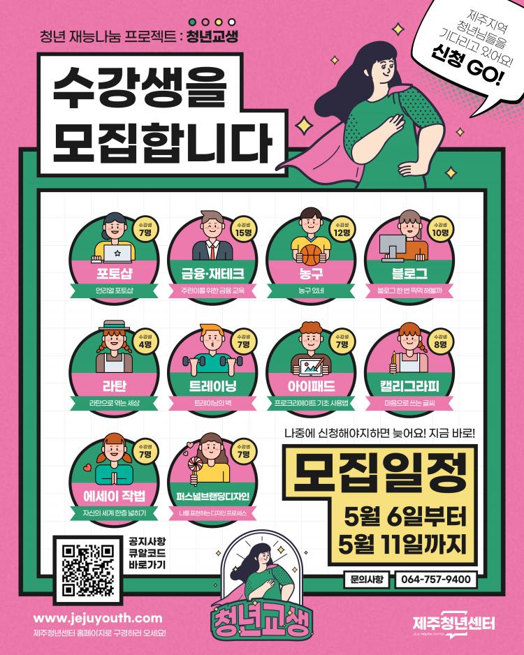 Âü¿© ½ÅûÀº 5¿ù 6ÀϺÎÅÍ 5¿ù 11ÀϱîÁö Á¦ÁÖû³â¼¾ÅÍ È¨ÆäÀÌÁö(www.jejuyouth.com)¿¡¼ ÇÒ ¼ö ÀÖÀ¸¸ç, °¢ Ŭ·¡½ºº° ¸ðÁýÀοø ¼ö¿¡ µû¶ó ¼±Âø¼øÀ¸·Î ¸¶°¨µÈ´Ù.