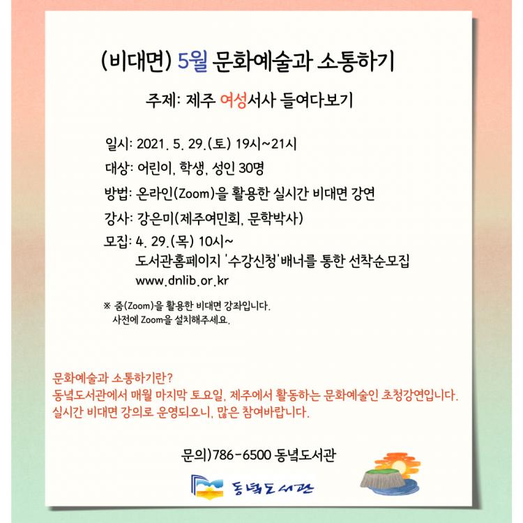 À̹ø¡®¹®È¿¹¼ú°ú ¼ÒÅëÇϱ⡯¿¡¼´Â °Àº¹Ì(Á¦ÁÖ¿©¹Îȸ)°»ç°¡ ¡®Á¦ÁÖ ¿©¼ºÀÇ »î¿¡ °üÇÑ À̾߱⡯¸¦ Áø¼ÖÇÏ°í ´ã¹éÇÏ°Ô À̾߱âÇÑ´Ù. ¿î¿µÀº ¿Â¶óÀÎ(Zoom)À» Ȱ¿ëÇÑ ½Ç½Ã°£ ºñ´ë¸é °ÀÇ·Î 5¿ù 29ÀÏ(Åä) ¿ÀÈÄ 7½Ã¿¡ ¿î¿µÇÑ´Ù.